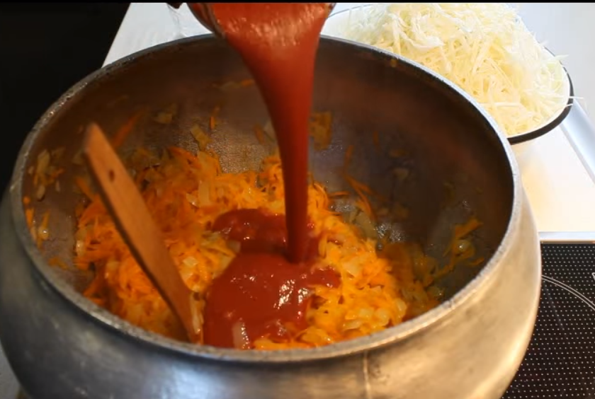 - В ту же большую сковороду добавьте столовую ложку масла, если нужно, лук и морковь. Жарить на среднем или сильном огне 5 минут. Добавьте половину нашинкованной капусты. Перемешайте и обжарьте еще 5 минут. Добавьте оставшуюся капусту, томатный соус или пасту, специи, хорошо перемешайте и тушите на среднем огне 20 минут, время от времени помешивая. На этом этапе, если капуста начинает слишком коричневеть, добавьте немного воды, перемешайте и продолжайте обжаривать.