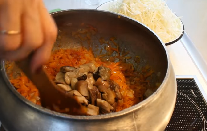 Пока мы шинковали капусту, грибы успели обжариться. Не забывайте их помешивать в процессе жарки, чтобы не подгорели.