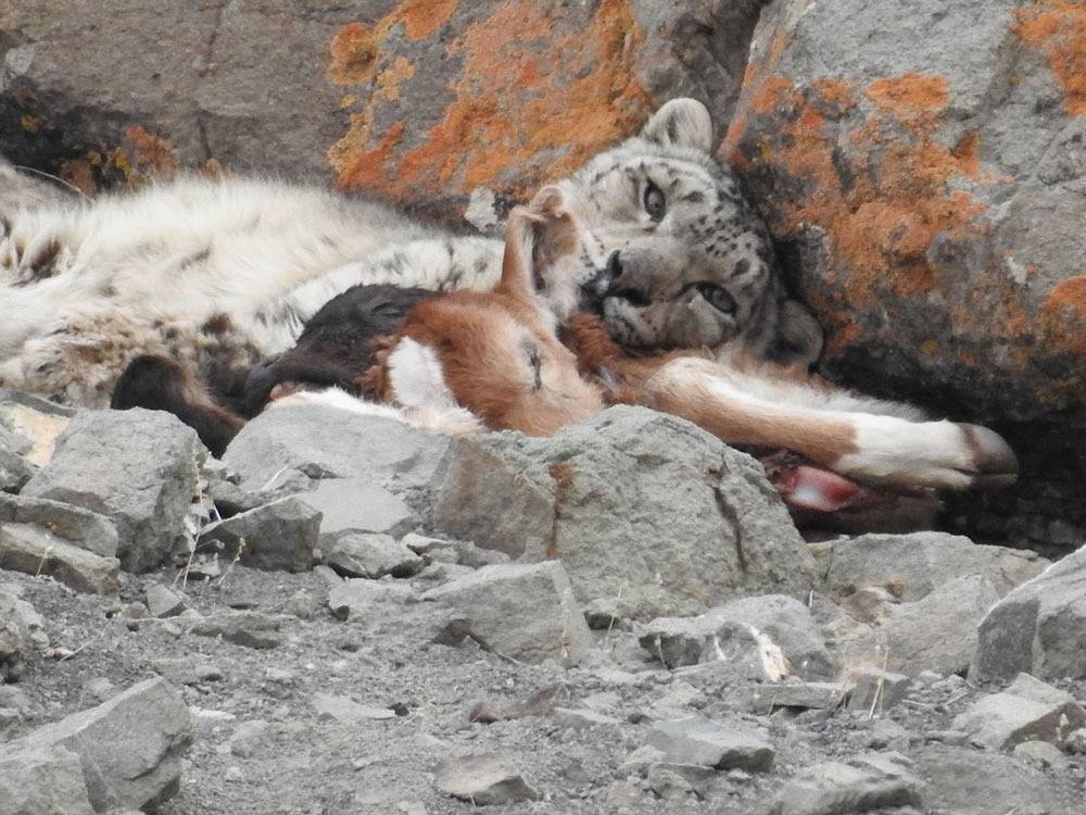 Хищник тщательно подбирает место для укрытия возле водопоя, солонцов или троп. Как только потенциальная жертва приблизится на расстояние 6-10 метров, снежный барс совершает прыжок и впивается в шею, стараясь ее сломать. Если попытка оказалась неудачной, зверь практически всегда отступает без длительного преследования.