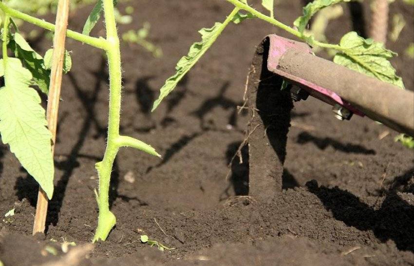 После полива почву вокруг кустов следует подрыхлить. Это улучшит поступление воздуха и влаги к корневой системе растения. Во время рыхления проводят удаление сорной травы. Сорняки забирают на себя влагу и питательные вещества из почвы, чем мешают развитию помидоров.