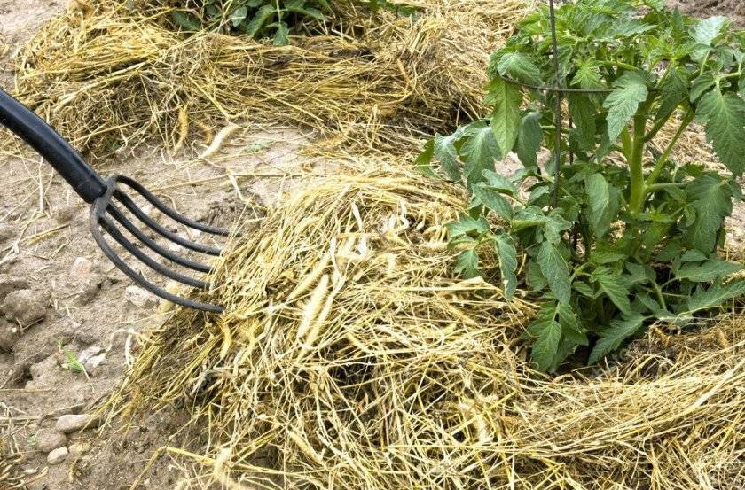 Мульчирование проводят смесью из навоза с соломой, опилками или хвойной листвой: эти органические субстанции хорошо аккумулируют влагу и предотвращают появление заболеваний. Процедуру проводят сразу после высадки рассады в грунт. Для этого смесь для мульчирования раскладывают по поверхности, где растут помидоры, слоем 4–5 см. Чтобы во время полива мульча не препятствовала попаданию воды на стебель, вокруг него следует оставлять немного пространства.
