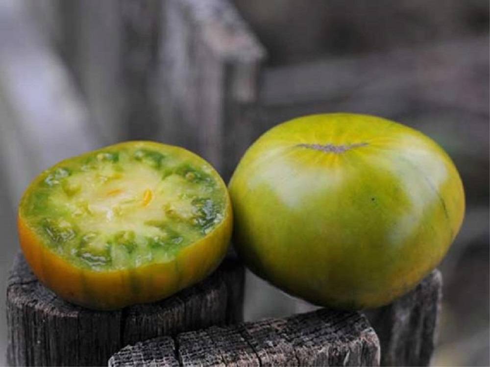 - мякоть с повышенным содержанием сахара, сочная, зеленого цвета, вкус нехарактерный для томатов (экзотический, отдаленно напоминает киви или дыню).