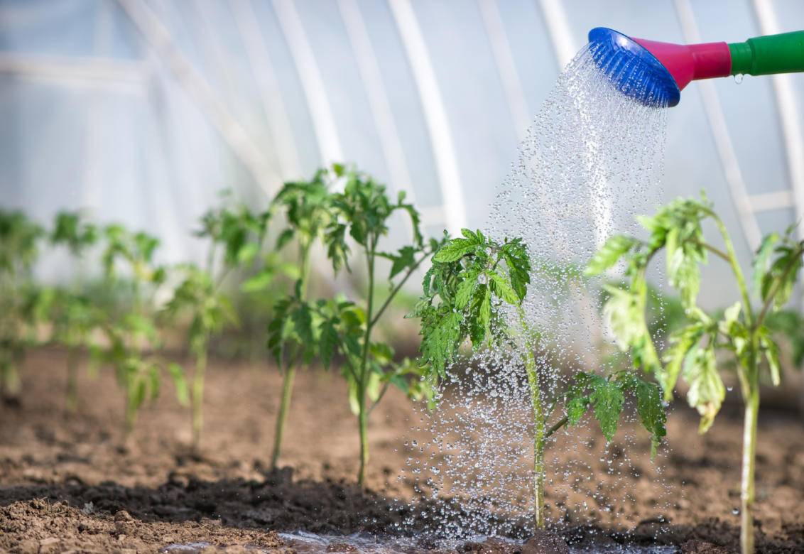 Томаты очень не любят, когда вода попадает на их стебли и листья, поэтому поливают их всегда только под корень. Поэтому, наилучшим приспособлением для этого вида ухода будет являться лейка без сита. Не стоит слишком частом злоупотреблять орошением. Во время цветения поливайте помидора один раз в 7 дней в примерных пропорциях 12 литров воды на 1 м².