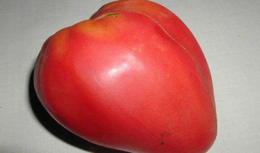 - плоды томата обладают сердцеобразной формой, ярко-малиновой насыщенной расцветкой. В среднем вес одного достигает 500–600 г. Имеют приятный, очень нежный вкус без кислинки, и ярко выраженный томатный аромат;