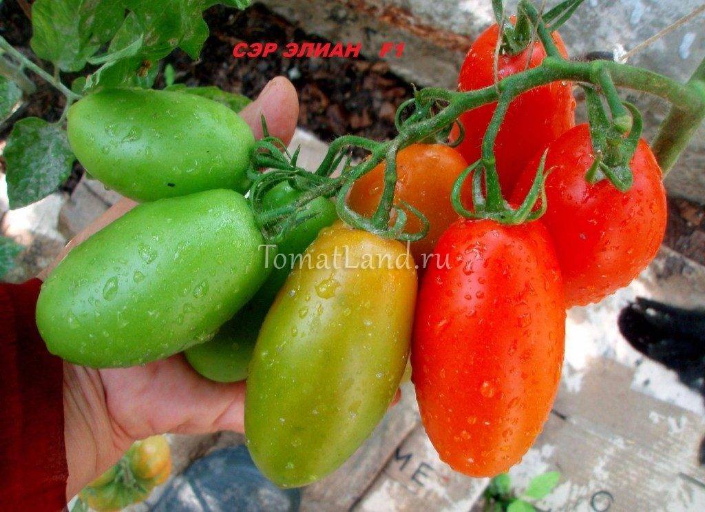 Сорт помидор Толстой F1Сорт томатов Сэр Элиан F1 Сэр Элиан F1 — ранний красноплодный томат-сливка от французских селекционеров. Плоды удлиненные, вес каждого 130-150 г. В каждой кисти 7-9 плодов. Очень урожайный сорт. Первые плоды собирают на 55-60 день от высадки рассады.