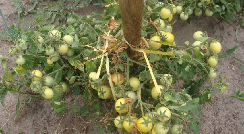 По фото и описанию видно, что ветви буквально усыпаны спелыми овощами. Каким бы ни был мощным ствол, он не выдержит такого количества плодов. Ветви начнут стелиться по земле, а овощи загниют при соприкосновении с грунтом. Поэтому их подвязывают к дополнительной опоре, установленной рядом с каждым саженцем.