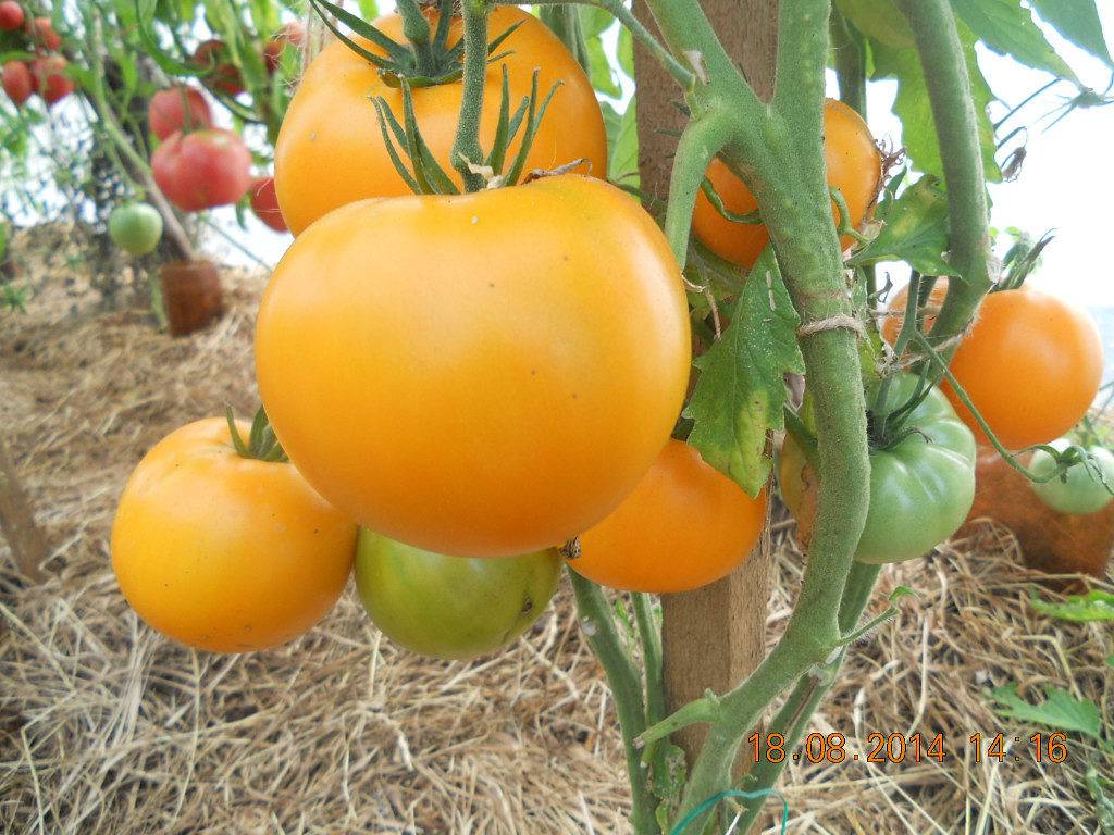 Среднеспелые высокорослые томаты дают средние плоды апельсинового цвета. Сорт ценят за сочные, мясистые, сладкие плоды.