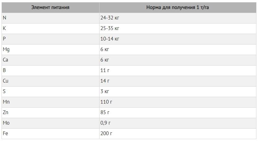 | Микроэлемент | Что происходит при дефиците вещества? | Нормы для 1 т зерна |