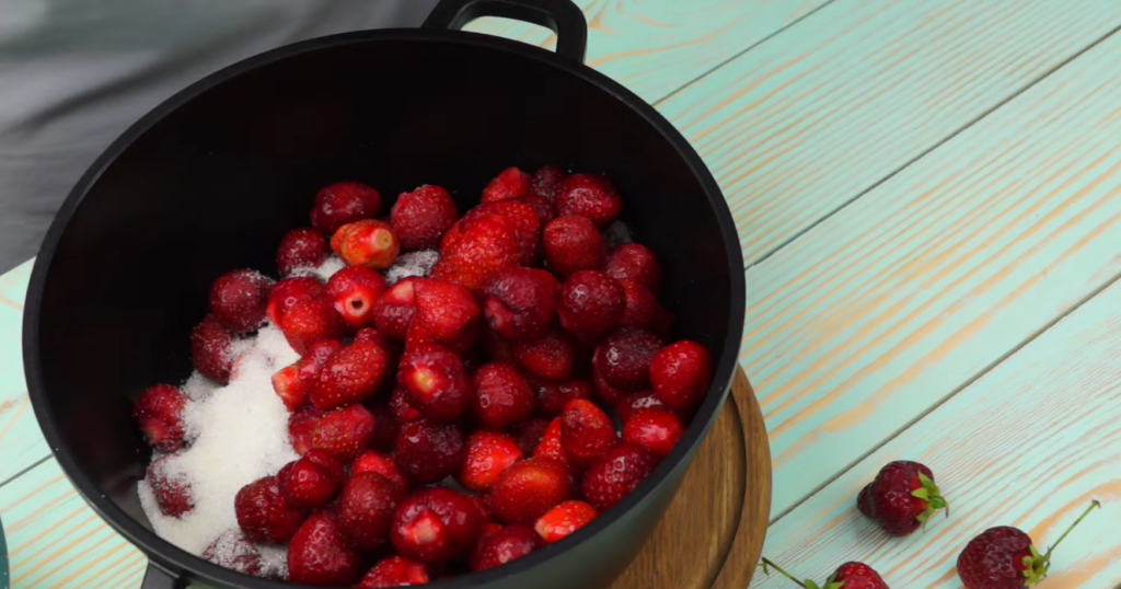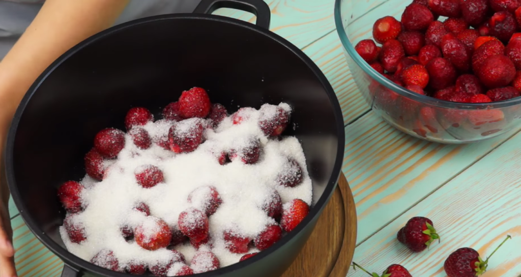 Пропорция сахара и клубники 1:1, но можно добавить сахара немного меньше, так как ягоды и так очень сладкие. На 1 кг клубники должно быть минимум 650 грамм сахара, чтобы ягода не заиграла. Мы будем использовать в приготовлении всего 800 грамм сахара.