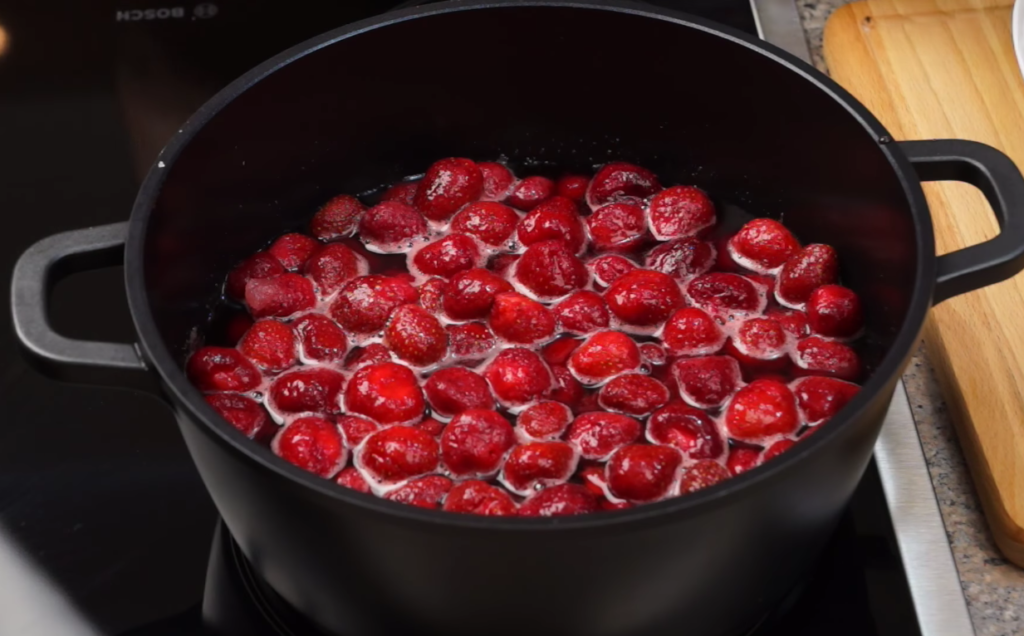 Клубника простояла 3 часа, дала немного сока. Теперь поставить кастрюлю на плиту и довести до кипения.