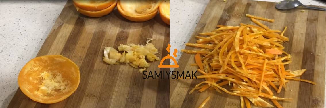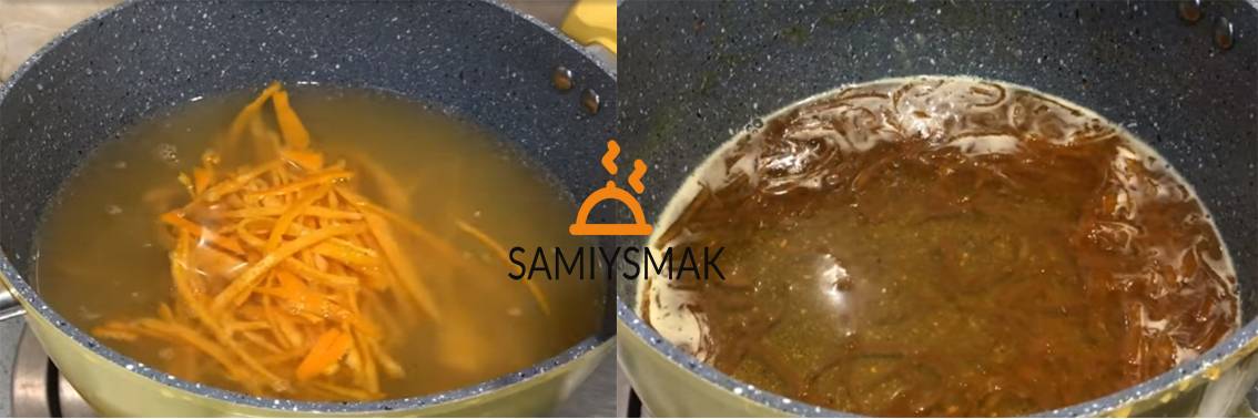 Корки изнутри очистите ложкой от белой мякоти. Должна остаться только оранжевая корка. Нарежьте корку тонкой соломкой.