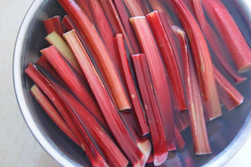- В кастрюлю с кипящей водой поместить нарезанные по 1 см длиной черешки ревеня, пробланшировать минутку.