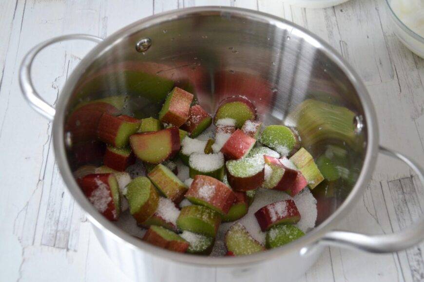 Шаг 3 — перемешать ревень с сахаром и поставить на огонь