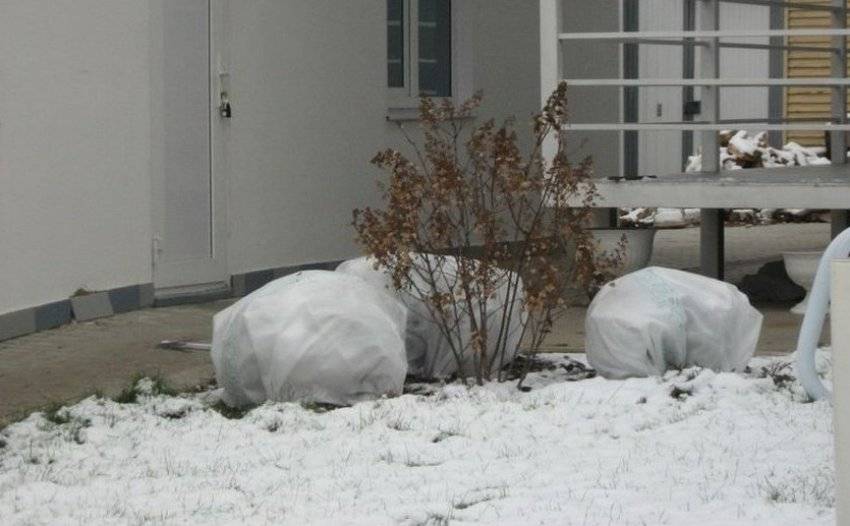 Укрытие. Чтобы защитить цветущий кустарник от холода и снега, незадолго до зимы его нужно обязательно укрыть. Для утепления применяют бескаркасный и каркасный способ. В первом случае побеги пригибаются к земле и прикладывают еловыми ветками или ботвой, во втором — вокруг кустарника забивают длинные колышки, вокруг которых обматывают плотный материал, такой как спанбонд или агрополотно.