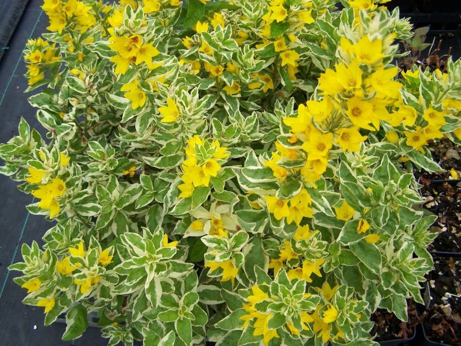 - Вербейник точечный – многолетний вид, вертикальные стебли которого формируют плотный куст высотой до 80 см. Листва имеет удлиненную форму. Бутоны размещаются в листовых пазухах по 1-2 шт. У них желтоватый венчик с оранжевой серединкой. У маленьких колокольчиков звездчатая форма. Разновидность предпочитает затемненные места посадки, влажный грунт, зацветает поздно – в конце июня. Растение стоит ограничивать, поскольку оно быстро разрастается, вытесняя соседей. Популярные сорта: Alexande с белой и Golden Alexander с золотистой окантовкой по краю листовой пластины.