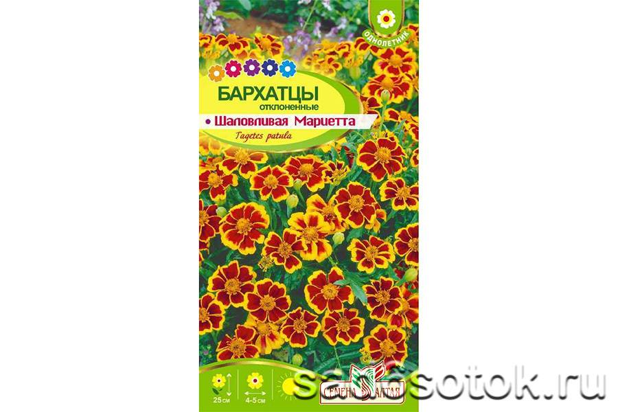 «Озорная Мариэтта» — среди французских или отклоненных бархатцев это самый популярный сорт. Второе его название «Шаловливая Мариэтта». Размер куста не превышает 30 см. Плоские, немахровые соцветия вырастают до 5 см. Окраска двухцветная – на золотисто-желтом фоне красно-коричневые мазки у основания. Листья перисто-рассеченные, края покрыты зазубринами.