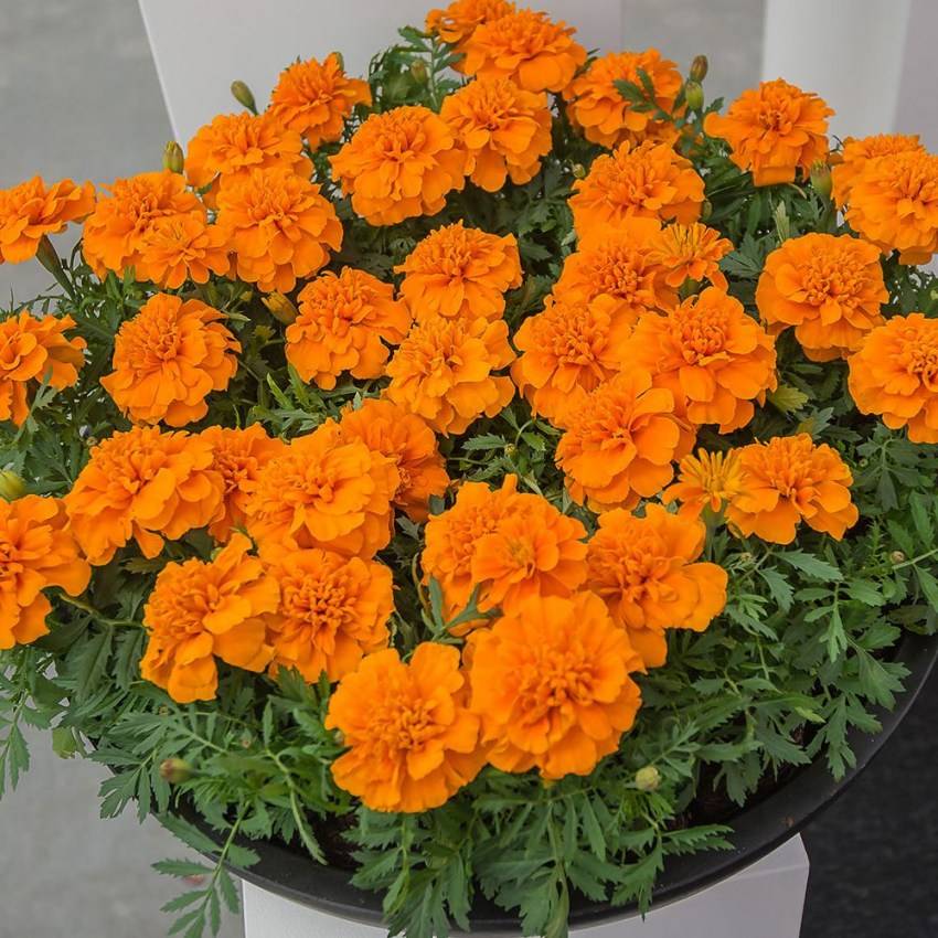 Роскошный оранжевый гвоздикоцветковый сорт относят к высокорослым – мощные кусты вырастают до 105 см высотой. Растения ветвистые, темно-зеленого цвета, крепкие. Крупные соцветия впечатляют ‒ плотные, махровые, густого оранжевого тона, диаметром 12–15 см. Устойчивые бархатцы преимущественно высевают в открытый грунт – при апрельском посеве цветение можно получить уже в конце июня.