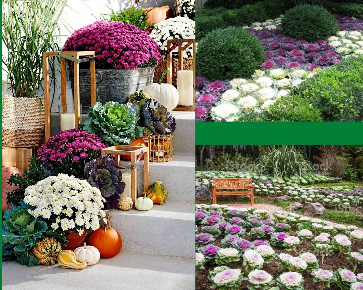 Благодаря своему роскошному виду декоративная капуста нашла свое применение не только на огородном участке, но и в ландшафтном дизайне. Особо активно ее используют для декора садов, клумб и прочих цветочных насаждений с конца лета вплоть до глубокой осени, поскольку растение комфортно чувствует себя даже в «негостеприимном» климате: ему не страшны проливные дожди и даже морозы (капуста вполне жизнеспособна, когда на улице около 5 градусов ниже нуля.