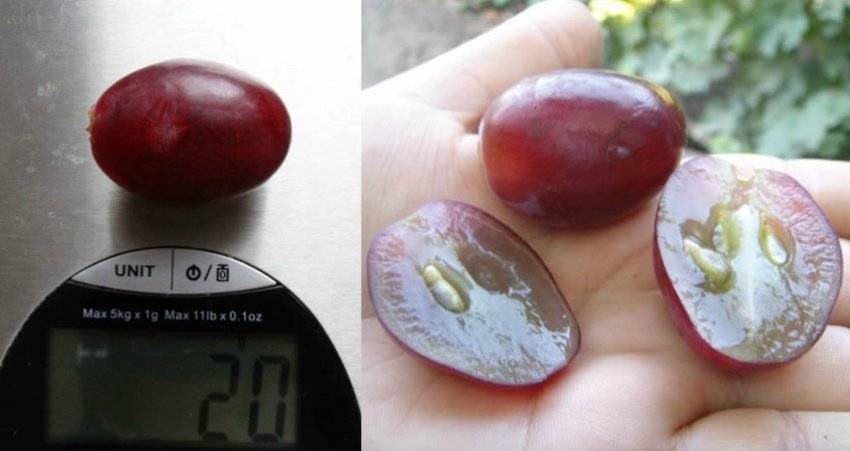 В гроздях формируются большие виноградины в виде овалов. В зрелом состоянии они имеют тёмно-красную окраску с густым восковым налётом. В среднем 1 виноградина может весить от 15 до 25 г.