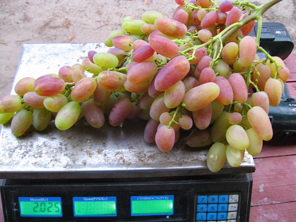 Вес одной грозди колеблется в пределах 800 -1000 г. Однако при правильном уходе и хорошей погоде можно получить кисти в 2-3 раза больше.