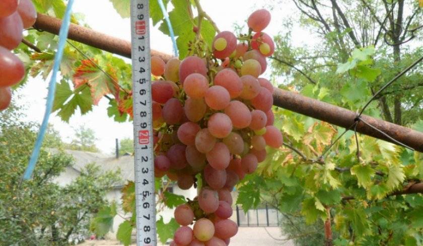 Молодые растения приносят свой первый урожай через год после посадки. На рост и созревание кисти нужно 90–100 дней, поэтому этот сорт считается ранним. В южных районах полакомится ягодами можно уже под конец июля. Вес одной спелой кисти может колебаться в пределах 0,4–0,7 кг. Она состоит из крупных, сосковидных или овальных ягод весом 7–12 г. В длину они могут быть около 36 мм, а в ширину — 22 мм. Их кожица тонкая, но прочная, розового цвета. Под ней находится мясистая сладкая мякоть с мускатными нотками и нотками черешни во вкусе.