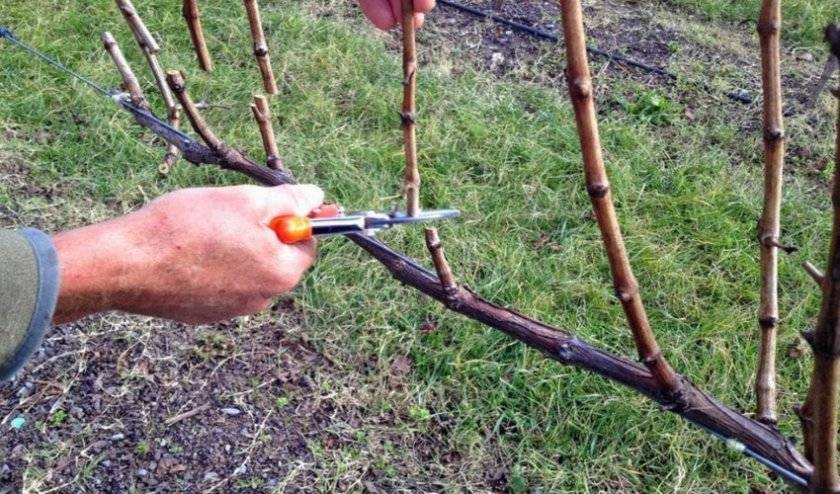 Лозу рекомендуется разгружать, потому что лишние побеги делают куст слабее. Делают это осенью, плодоносящие побеги обрезают, оставляя 8 глазков, больше не имеет смысла.