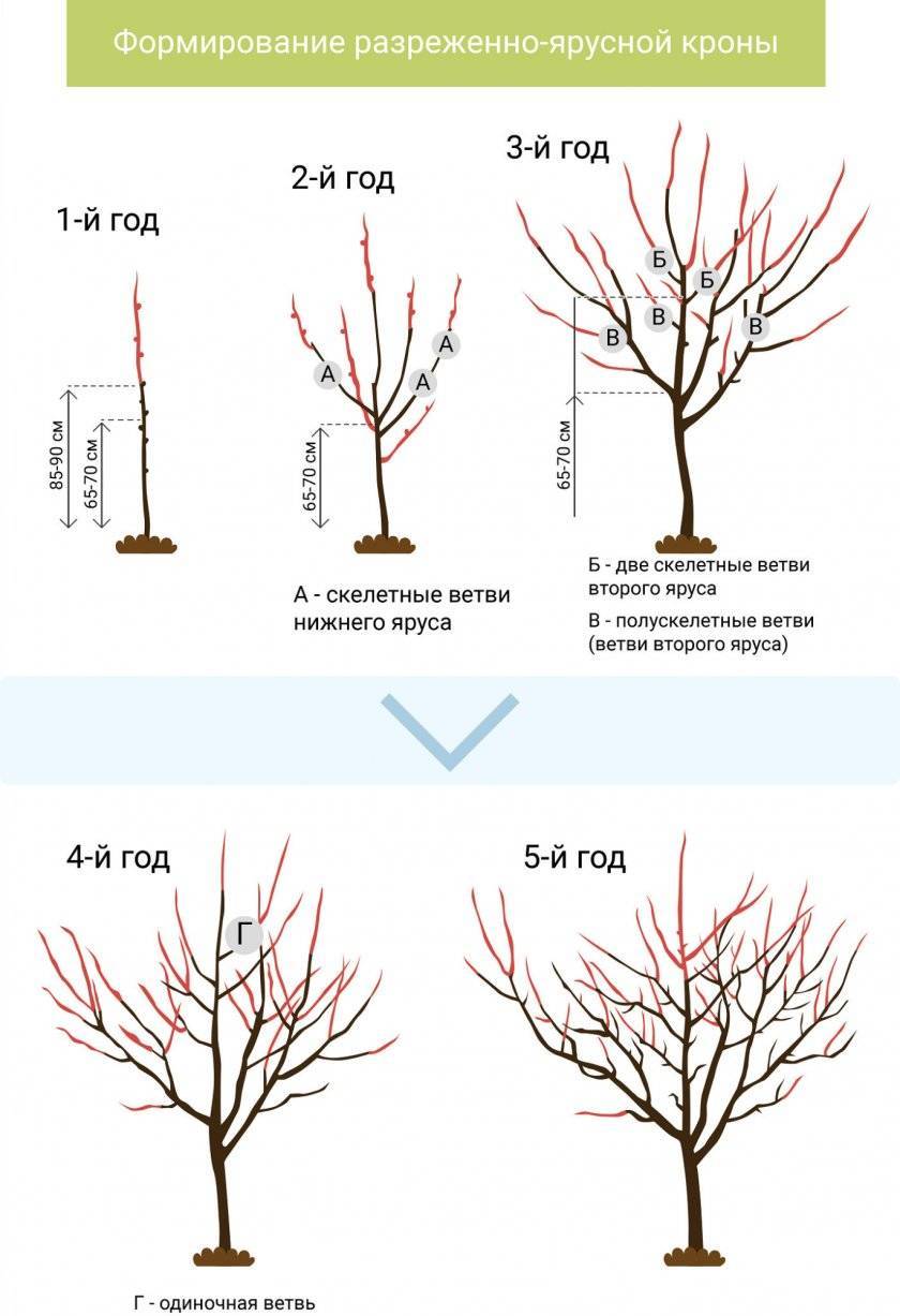 Летом сформировать скелетные ветви путём удаления всех побегов, оставив лишь 4, размещённые сверху и растущие в разные стороны.