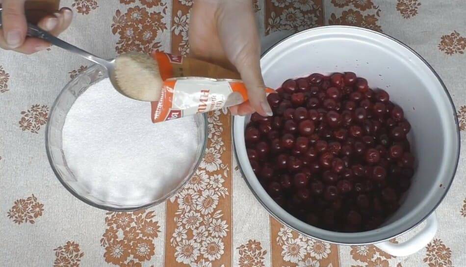 Затем вишню засыпаем сахаром и даем немного постоять, чтобы вишня пустила сок.