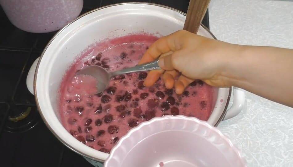 - Аккуратно добавлять порции желатиновой массы, одновременно с этим перемешивая вишню. Сразу же снять с огня.
